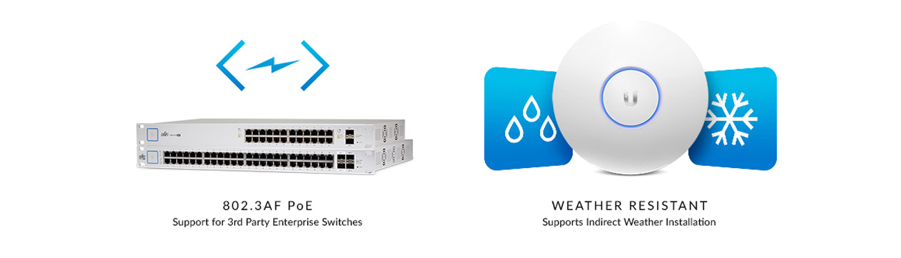Das UniFi AP AC PRO verfügt über zwei Gigabit-Ports mit PoE 802.2af-Unterstützung. Das wetterfeste Gehäuse ermöglicht den Einsatz sowohl im Innen- als auch im Außenbereich.