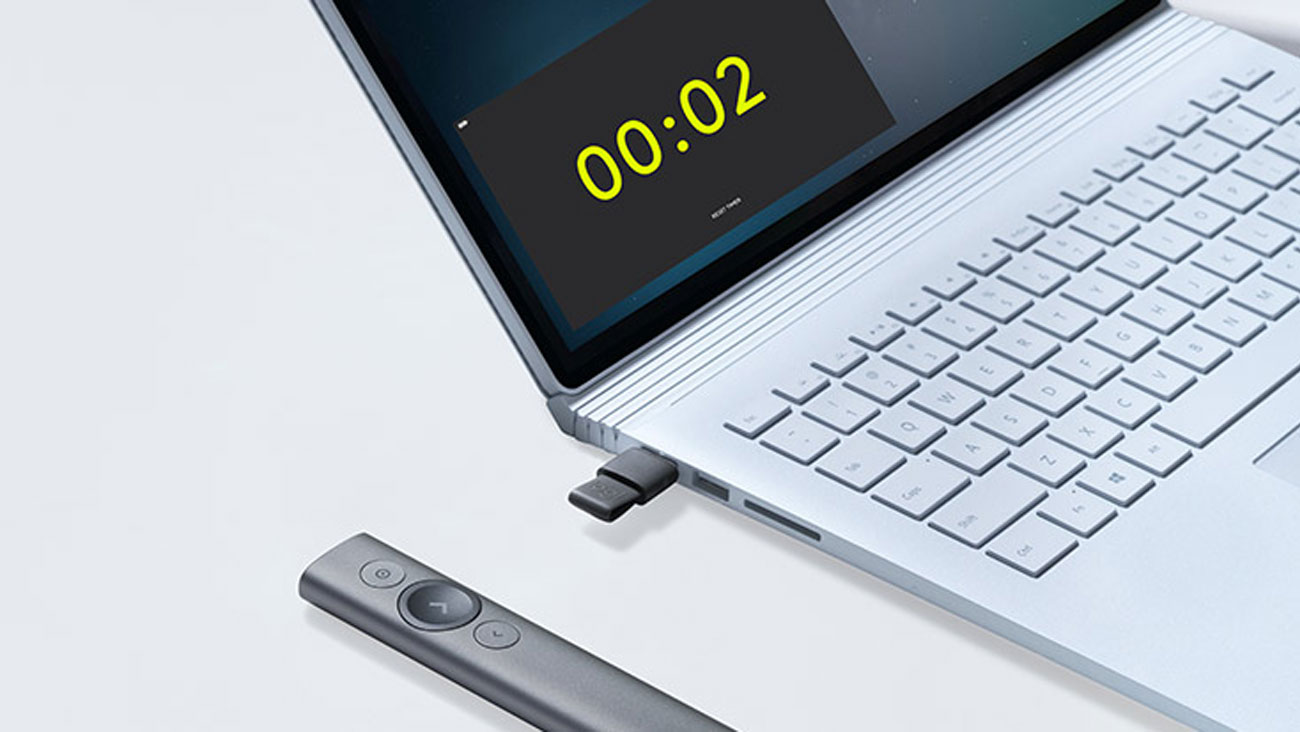 Spotlight Plus erinnert den Präsentator leise daran, dass es Zeit für eine Zusammenfassung ist. Fünf Minuten vor Ende der Präsentation und erneut nach Ablauf der gesamten Zeit beginnt die Fernbedienung zu vibrieren. Der Sprecher kann Störungen und unerwünschte Unterbrechungen eliminieren, die Präsentationszeit verfolgen und Vibrationsalarme in der Logitech Presentation App anpassen.