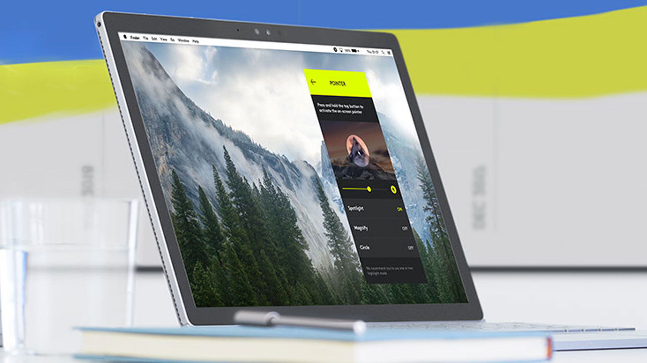 Das fortschrittliche Zeigersystem ermöglicht präzises Hervorheben und Vergrößern. Der Bildschirmcursor ermöglicht das Abspielen und Anhalten von Videos, das Öffnen von Links usw. Eine sofortige Verbindung ist über den USB-Empfänger oder die Bluetooth®-Technologie möglich.