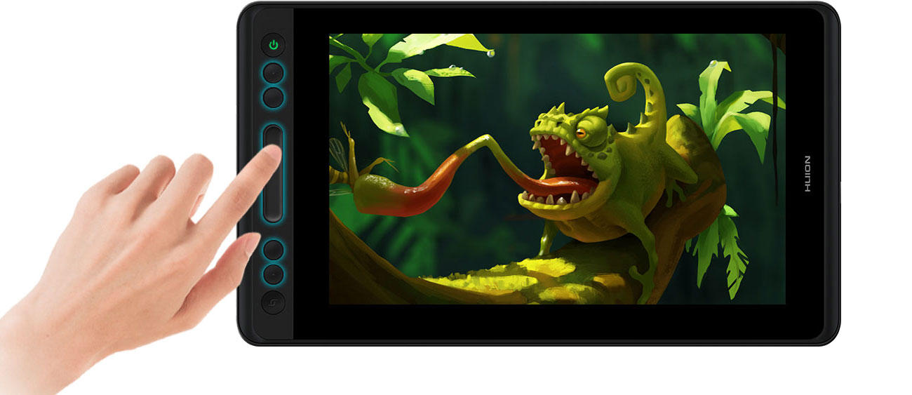 Vier benutzerdefinierte Schnelltasten und das Touch-Panel befinden sich auf der linken Seite des Bildschirms. Weise den Tasten über die Einstellungen Funktionen zu, um schnell auf deine Lieblingsfunktionen zugreifen zu können. Der praktische Touch-Bar steuert das Zoomen, Verkleinern und Scrollen von Bildern und Pinseln. Nutze diese Einstellungen, um deine Arbeit zu optimieren.