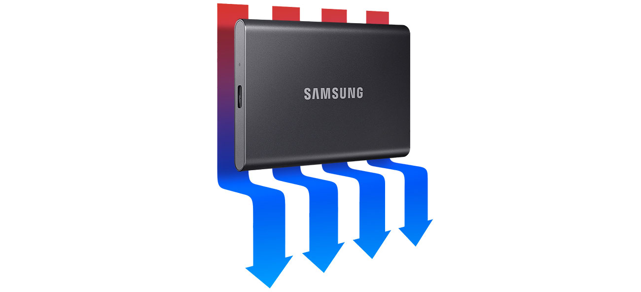 Keine Sorge mehr vor Überhitzung. Die fortgeschrittene thermische Lösung im Samsung T7 nutzt die ePCM-Technologie sowie den Dynamic Thermal Guard. Dadurch bleibt dieses kompakte Gerät immer auf einer optimalen Temperatur – auch bei hohen Betriebsgeschwindigkeiten.