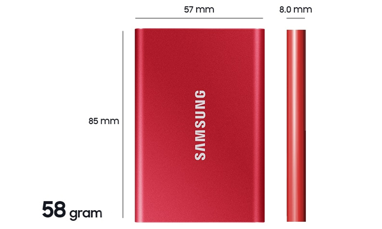 SSD (Solid State Drive) bedeutet, dass der Samsung T7 keine beweglichen Teile enthält. Das Gerät, das mit einem AES 256-Bit verschlüsselten Passwort geschützt werden kann, wird von einem robusten, aluminiumgefertigten Gehäuse geschützt, das Daten selbst bei einem Fall aus 2 Metern Höhe sichert. Die Größe des Laufwerks ähnelt einer Kreditkarte und es wiegt nur 58 Gramm, was es sehr handlich macht.