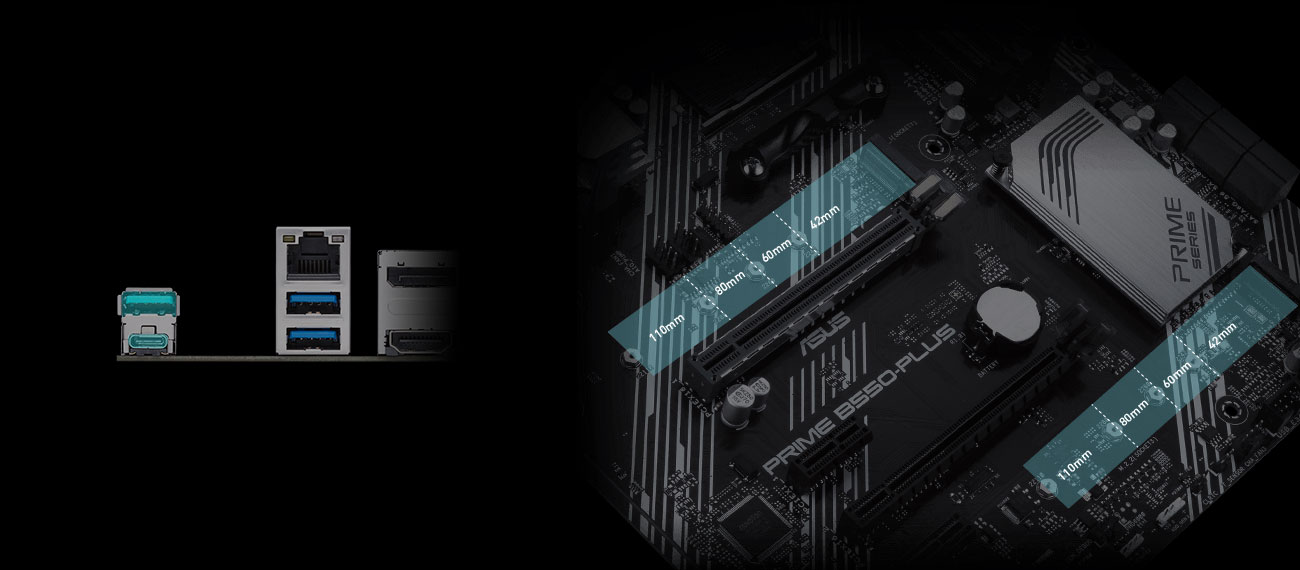 Mit der durch den PCIe Gen3 x4 Interface garantierten Bandbreite bietet einer der M.2-Anschlüsse auf dem PRIME B550-PLUS Mainboard eine maximale Bandbreite von bis zu 64 Gb/s. Eine schnelle NVMe SSD ist daher eine ausgezeichnete Wahl für die Installation des Betriebssystems oder als Arbeitsplatz für Daten. Unter den externen Anschlüssen des Mainboards findest du viele USB-Ports, darunter zwei USB 3.2 Gen2 (einschließlich USB-C), die eine maximale Bandbreite von bis zu 10 Gb/s bieten. Wichtig ist, dass das Mainboard auch Anschlüsse für den vorderen USB-Panel des Gehäuses hat. Der Realtek RTL8111H Netzwerk-Controller garantiert eine stabile und schnelle Verbindung. Dadurch bietet das ASUS PRIME B550-PLUS Mainboard eine LAN-Bandbreite von 1 Gb/s. Wichtig ist, dass der RJ-45-Port mit einem eingebauten ASUS LANGuard Überspannungsschutz ausgestattet ist.