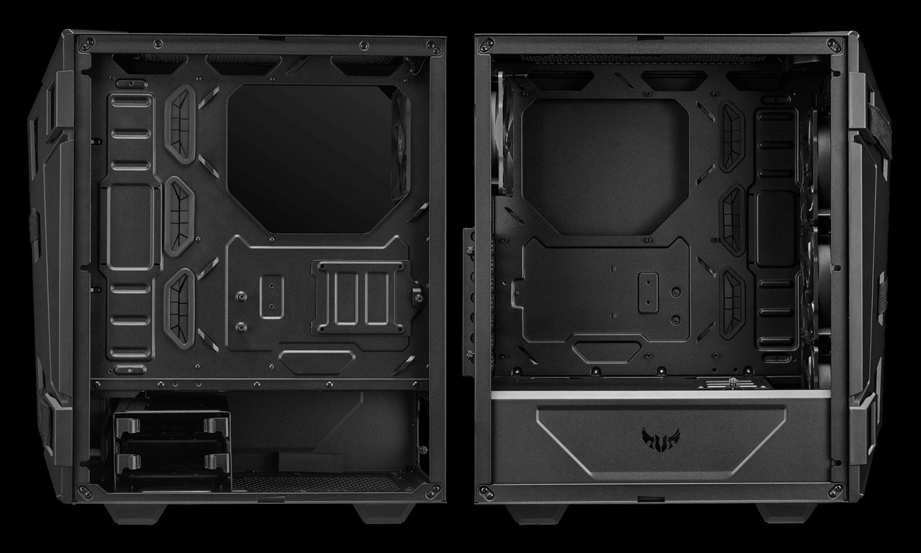Staubfilter, Kompatibel mit dem Asus Aura Beleuchtungssystem, RGB-Controller außerhalb des Gehäuses, Einbau des Netzteils an der Unterseite des Gehäuses, Loch zur Unterstützung der Installation eines CPU-Kühlers, Kabelmanagementsystem, Kopfhöreraufhänger