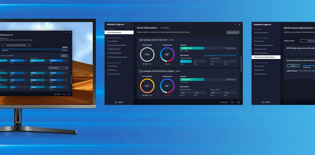Die kostenlose Management-Software, die das ganze Potenzial deiner SSD ausschöpft. Mit der aktuellen Version Samsung Magician 6.1 hast du deine SSD stets unter Kontrolle, behältst die Funktionszustände und Statusparameter im Auge und kannst sogar die Leistungsfähigkeit optimieren.