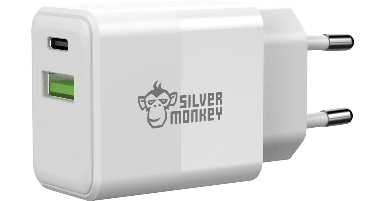 Das schicke weiße Silver Monkey Netzladegerät ist mit zwei Ladeanschlüssen ausgestattet: USB-A und USB-C. So kannst du bis zu zwei Geräte gleichzeitig mit Strom versorgen. Außerdem benötigt das Zubehör nur wenig Platz, was den Nutzungskomfort wesentlich erhöht.