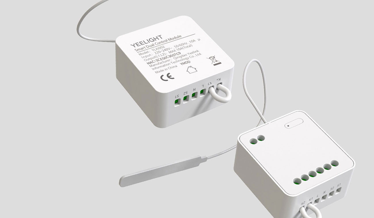 Das Yeelight Smart Dual Control Module, das über ein duales WiFi/Bluetooth-Modul verfügt, kann herkömmliche Geräte in intelligente Geräte verwandeln und sie mit dem Netzwerk verbinden, so dass sie auf verschiedene Weise gesteuert werden können - über die App, mit einer speziellen Fernbedienung oder per Sprache.
