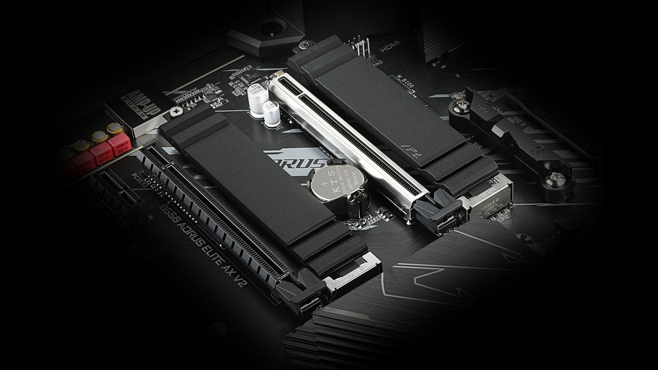 Mit zwei ultraschnellen M.2-Anschlüssen am B550 AORUS ELITE AX V2 Hauptboard kannst du die schnellsten NVMe SSDs anschließen. Einer davon unterstützt den PCIe Gen4 x4 Standard und bietet so eine maximale Bandbreite von bis zu 64 Gb/s.