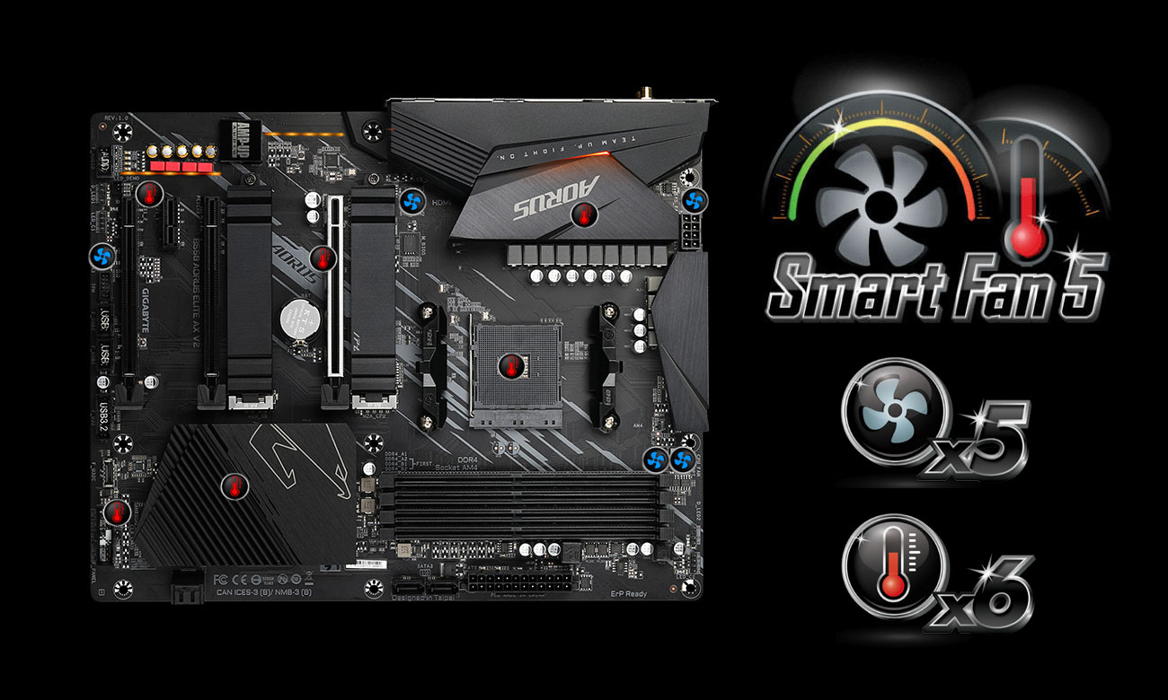 Das Modell B550 AORUS ELITE AX V2 nutzt zahlreiche Ultra Durable-Lösungen, wie z.B. einen mit Metall verstärkten PCI-E-Slot. Das Hauptboard verfügt auch über das Smart Fan 5-System: ein Set aus 5 Lüfteranschlüssen und 6 Temperatursensoren, die volle Kontrolle über die Kühlung des Computers ermöglichen. Über die Temperaturen der leistungsstarken Stromversorgungssektion und der M.2-Disks wacht ein System aus massiven Kühlerkörpern und thermischen Abdeckungen.