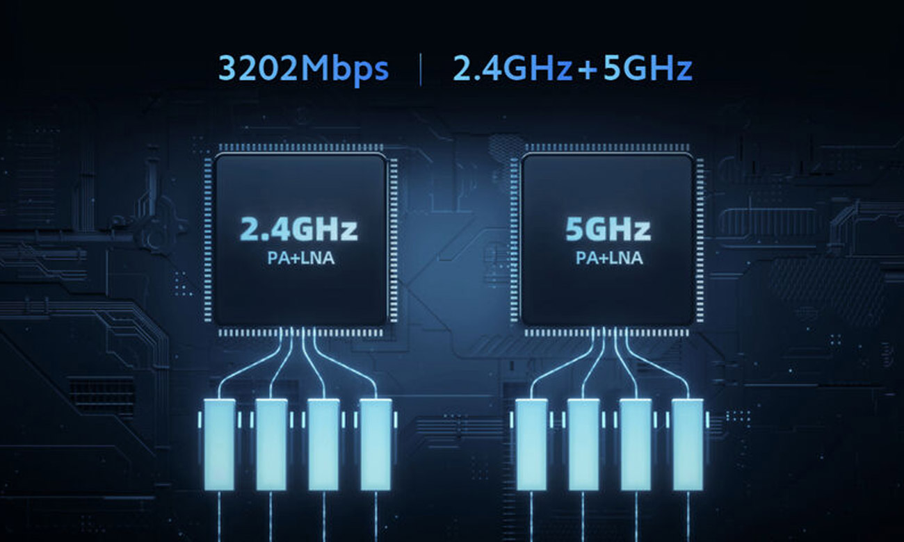 Der Xiaomi AX3200 Router bietet sowohl 2,4 GHz als auch 5 GHz. Diese beiden Bänder kollidieren nicht miteinander, und ihre kombinierte theoretische drahtlose Geschwindigkeit erreicht bis zu 3202 Mb/s. Genieße ultraschnellen Internetzugang, stabilen Signalbereich, schnelles Surfen, flüssige HD-Videos und Online-Spiele in großem Umfang.