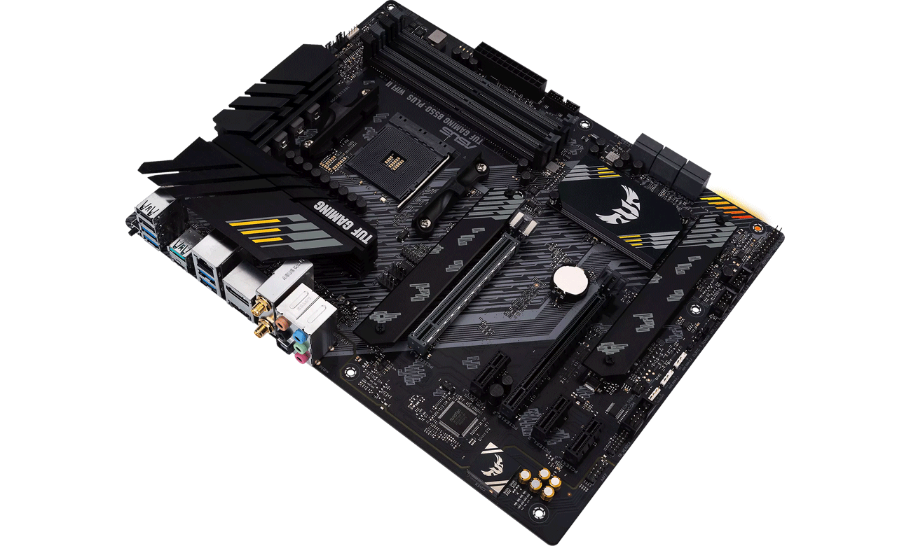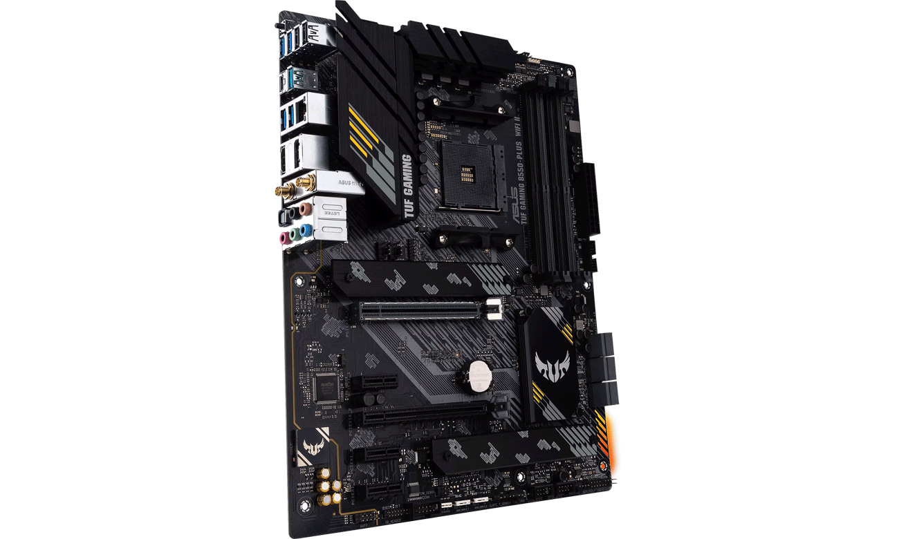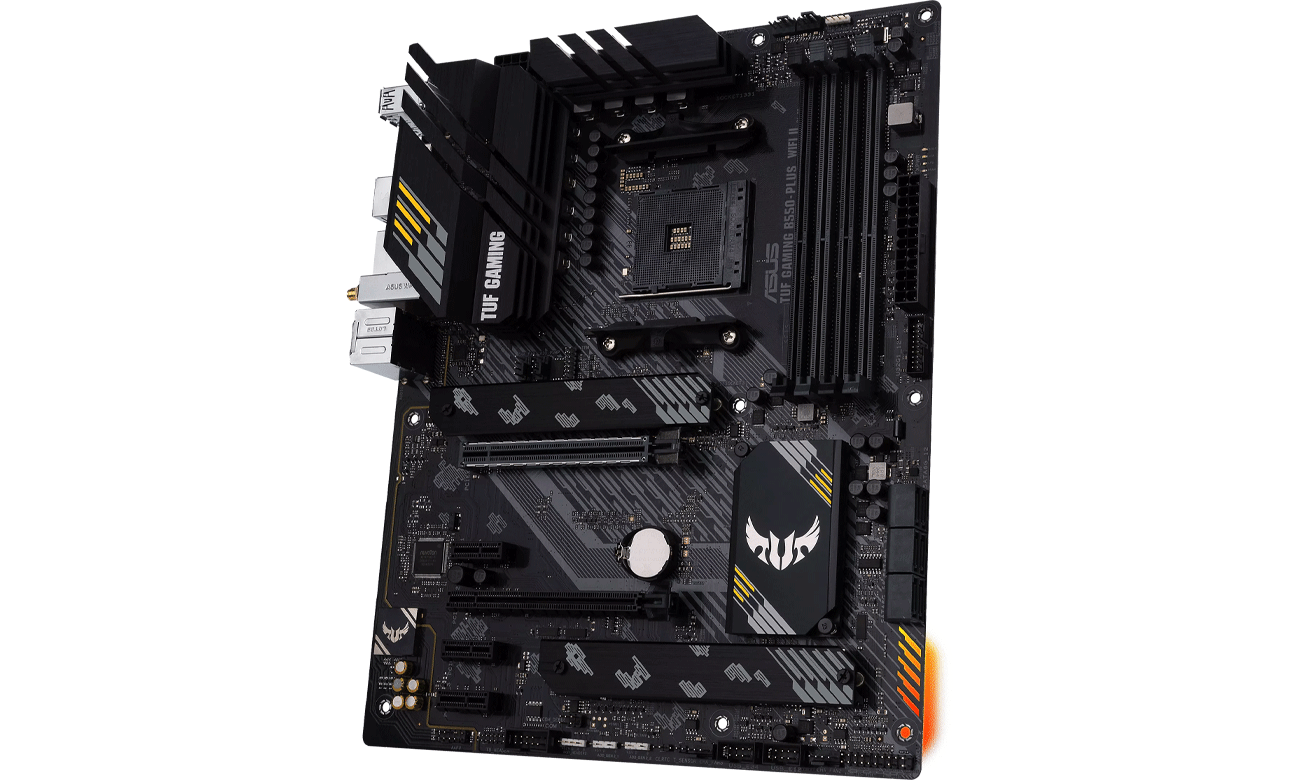 Der Energieversorgungsbereich des ASUS TUF GAMING B550-PLUS WIFI II Mainboards nutzt 8+2 Phasen DrMOS und einen digitalen Digi+ VRM Controller, um optimale Leistung für AMD Ryzen Prozessoren der 3. Generation zu liefern. Stabilität garantieren hochwertige TUF Drosseln und Kondensatoren, und eine zusätzliche Kupferschicht im PCB verbessert die thermischen Eigenschaften. Um niedrige Betriebstemperaturen zu gewährleisten, sorgen massive Kühlkörper für eine effiziente Wärmeableitung vom VRM, Chipsatz und M.2-Laufwerken. Mit 4 Temperatursensoren und 5 DC/PWM Lüfteranschlüssen kannst du die Kühlung deiner Konfiguration vollständig steuern. Über die Software Fan Xpert 2+ lässt sich die Lüftergeschwindigkeit leicht anpassen. TUF GAMING B550-PLUS WIFI II steht nicht nur für Leistung, sondern auch für Sicherheit. Deshalb wurden zahlreiche TUF-Schutzmaßnahmen implementiert, wie Schutz vor Überspannungen und elektrostatischen Entladungen. Außerdem wurde der PCIe x16-Slot verstärkt, um ihn für schwere Grafikkarten zu rüsten.