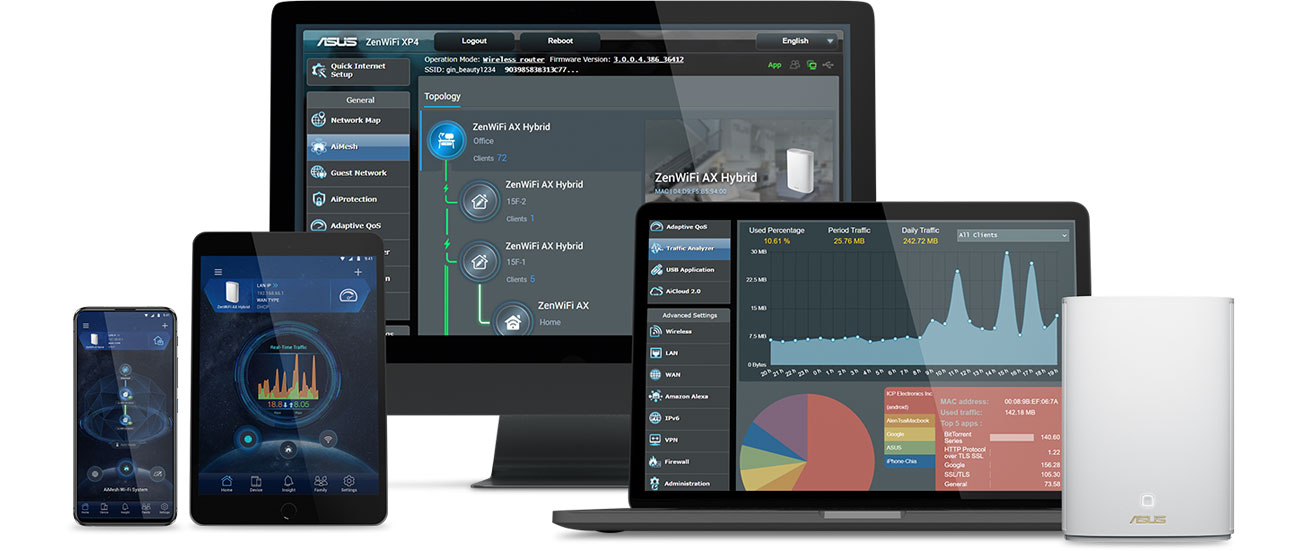 Das ZenWiFi AX Hybrid bringt deine Heim-WiFi-Verbindung auf ein völlig neues Niveau. Unterstützung für den 2x2 802.11ax Standard ermöglicht eine maximale Übertragungsbandbreite von bis zu 1800 Mb/s. Eine stabile und schnelle Verbindung bei hoher Geschwindigkeit mit mehreren Geräten gleichzeitig wird durch die QAM-Modulation ermöglicht. Das Gerät unterstützt auch die AiMesh-Technologie. Du kannst den WiFi-Bereich einfach durch Hinzufügen weiterer kompatibler Geräte erweitern.