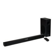 - Zweiteilige Soundbars, die zusätzlich über einen Subwoofer (Tieftöner) verfügen und somit tiefere Bässe erzeugen.