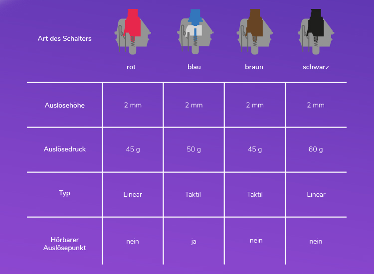 Wir haben für dich eine Tabelle zusammengestellt, damit du Tastatur-Switches findest, die wirklich zu dir passen. Die vier Schalterfarben stehen für ein Set an Eigenschaften: